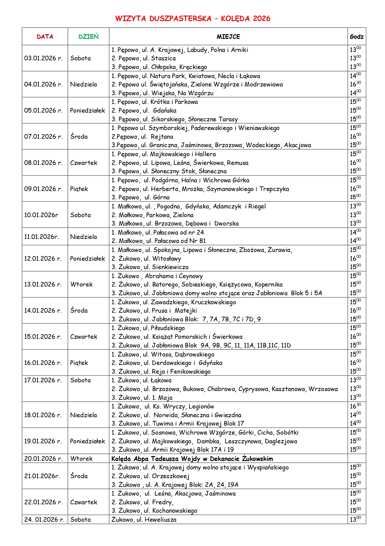 PLAN KOLĘD 2026 w kościele